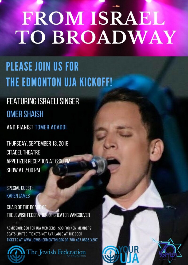 (EJN) – The Edmonton Jewish Federation and United Jewish Appeal are pleased to present a very special campaign kickoff event on Thursday September 13 featuring award winning Israeli singer Omer Shaish and acclaimed Israeli composer / pianist Tomer Adaddi. The theme of their performance will be From Israel to Broadway and it will be held at the Edmonton Citadel Theatre.
